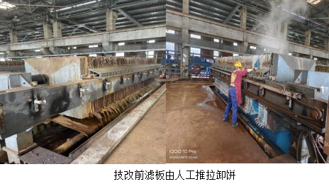 2022年3月威遠(yuǎn)藍(lán)鼎正式接手成渝釩鈦科技欣興釩廠新區(qū)水處理整套水處理系統(tǒng)。運(yùn)行至今,反應(yīng)釜壓濾機(jī)平臺(tái)在用的6臺(tái)壓濾機(jī)自動(dòng)卸餅功能全部損壞,每臺(tái)壓濾機(jī)87塊濾板,平均每臺(tái)卸餅在1.5小時(shí),每班人工依次卸餅一次,最高頻次兩次,人工勞動(dòng)強(qiáng)度大,工作效率低。高產(chǎn)期間無(wú)法滿(mǎn)足濾水要求,同時(shí)因?yàn)榄h(huán)境和勞動(dòng)強(qiáng)度致使員工離職率高。