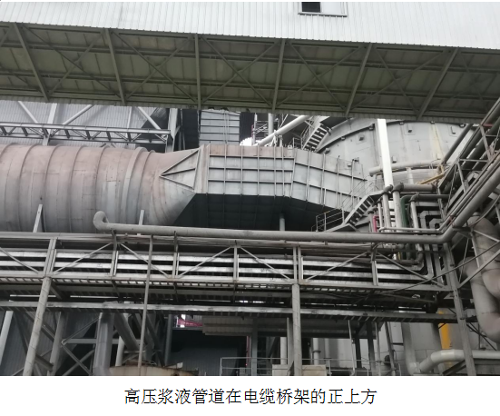 西昌藍鼎超低排放項目的電纜橋架和漿液管道同在一個門型鋼架上,而且高壓漿液管道處于電纜橋架的正上方,一旦發(fā)生高壓管道爆裂,高壓溶液噴射到電纜上,有可能會造成電纜沖破皮產(chǎn)生短路放炮事故。