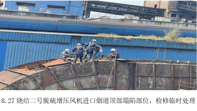 8月27日,檢修員在巡檢時(shí)發(fā)現(xiàn)并上報(bào)了燒結(jié)二號(hào)脫硫增壓風(fēng)機(jī)進(jìn)口煙道頂部約27㎥鋼板出現(xiàn)塌陷,威遠(yuǎn)藍(lán)鼎生產(chǎn)部高度重視,立即將風(fēng)險(xiǎn)隱患上報(bào)燒結(jié)廠(chǎng)部領(lǐng)導(dǎo),協(xié)商時(shí)間處理。當(dāng)天廠(chǎng)部協(xié)商停機(jī)4小時(shí)對(duì)脫落部位進(jìn)行臨時(shí)加固處理。8月28日,廠(chǎng)部利用高溫限電停機(jī)11小時(shí),對(duì)二號(hào)燒結(jié)進(jìn)口煙道頂部脫落位置進(jìn)行全面檢修。